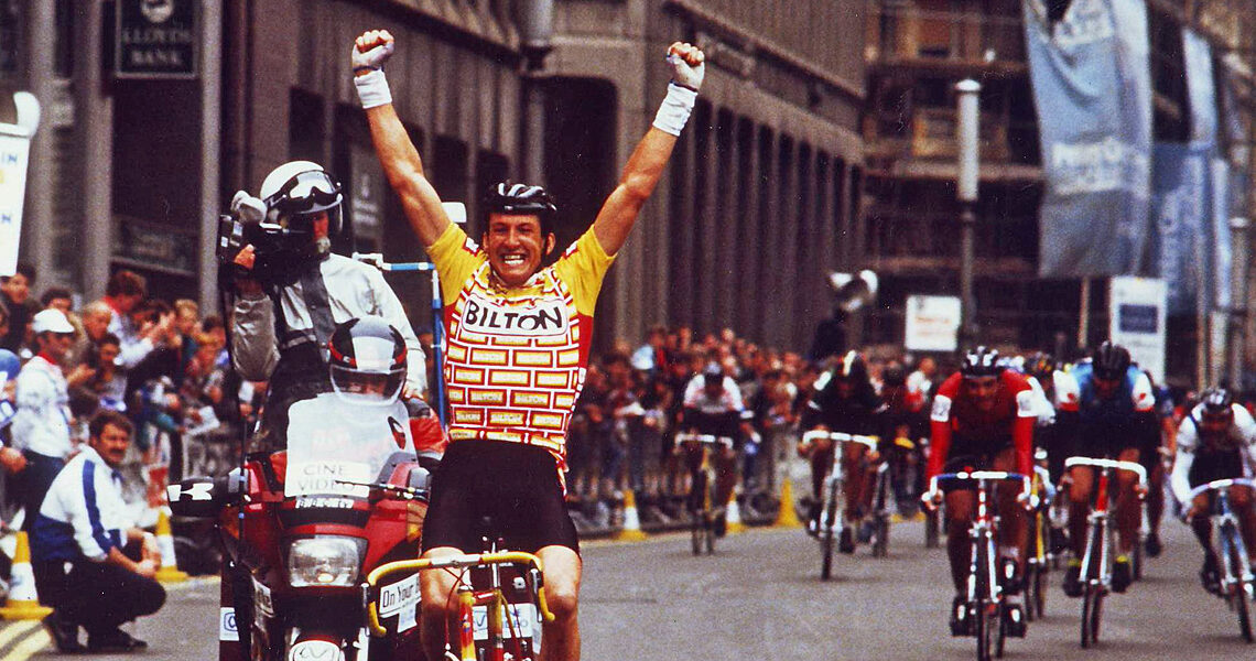 That was ’88, Stage 12, my role was to lead out our sprinter Mark Walsham for the hot spot sprints and stage finishes. Mark had won stage 11 Coventry Circuit race after we’d given him a perfect lead out so our morale was sky high. It was the last stage from Warwick Castle to Birmingham, 106 miles, there were nine laps of a finishing circuit and I was policing the breaks, there were two away and I got up to them then realised bunch was closing and attacked with 500 metres to go. And Mark won the overall points and sprints classification so it was a good race for us.