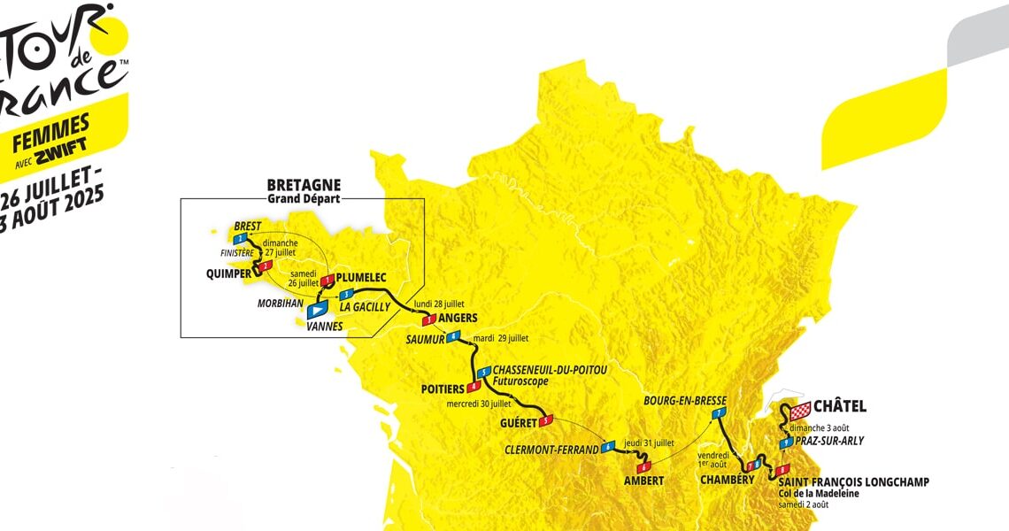 Tour de France Femmes avec Zwift 2025 Route: A wide diagonal stretches across the map of France, with over 1,000 kilometres separating Brest from the Alpine resort of Châtel as the crow flies, involving a total of 1,165 kilometres of pedalling for the riders, who will be competing for the first time over nine days […]