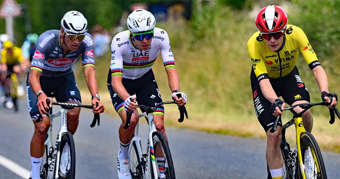 As the attackers make their way back to Montluçon, they face the first categorised climbs of the day. Ourselin goes first atop the Côte de Sainte-Thérence (107.5km), Côte d’Argenty (114km), Côte de Buffon (125.5km) and Côte de Domérat (140km) to all but secure the polka-dot jersey. He is then dropped while Thierry keeps going at the front. EF Education-EasyPost up the ante on the second ascent of the Côte de Buffon and Tadej Pogačar (UAE Team Emirates-XRG) already accelerates with almost 40 km to go. Jonas Vingegaard (Visma-Lease a Bike) is right on his wheel and the big guns look at each other. Fred Wright (Bahrain Victorious) seizes the opportunity to bridge the 10-second gap to Thierry. The two men work together to push their lead to 45 seconds into the final lap (31.8km). Thierry holds on to go first atop the Côte de Domérat, before Wright goes solo into the last 25km.