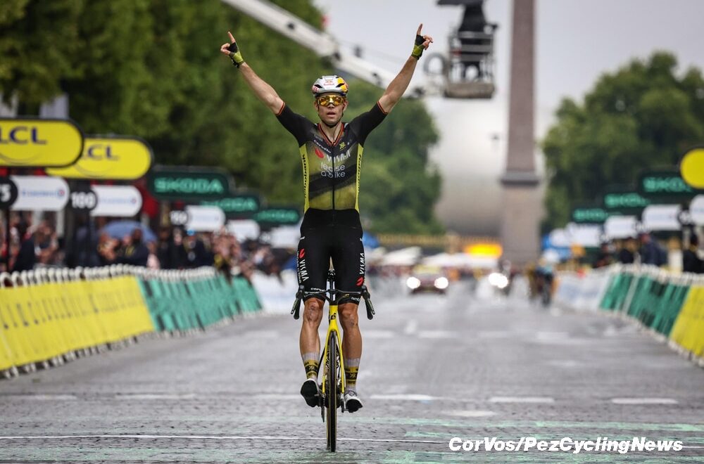 This unspoken agreement was manifest in the riders’ crossing the line first in a flurry, led heroically by a triumphant Wout van Aert, and then in a trickle: twos and fives, and tens and fifteens; mixes of different teams, and of GC contenders, climbers and sprinters. In virtually every other year domestiques would have been risking skin — and exhaustion — to shepherd a fast finisher to the front; this year, most eased over the line, chatting and smiling.